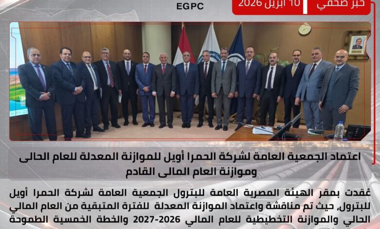 عُقدت بمقر الهيئة المصرية العامة للبترول الجمعية العامة لشركة الحمرا أويل للبترول، حيث تم مناقشة واعتماد الموازنة المعدلة للفترة المتبقية من العام المالي الحالي والموازنة التخطيطية للعام المالي 2026-2027 والخطة الخمسية الطموحة لزيادة الإنتاج والاحتياطي البترولى.