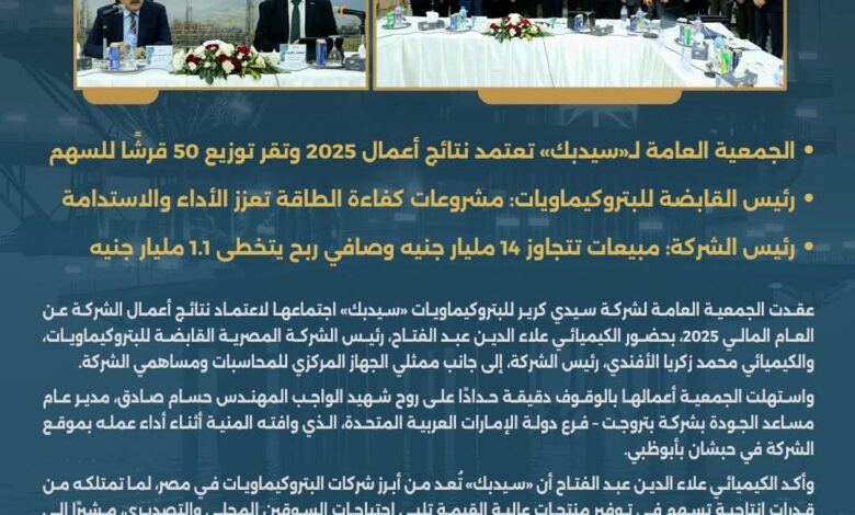 عقدت الجمعية العامة لشركة سيدي كرير للبتروكيماويات «سيدبك» اجتماعها لاعتماد نتائج أعمال الشركة عن العام المالي 2025، بحضور علاء الدين عبد الفتاح، رئيس الشركة المصرية القابضة للبتروكيماويات، و محمد زكريا الأفندي، رئيس الشركة، إلى جانب ممثلي الجهاز المركزي للمحاسبات ومساهمي الشركة.