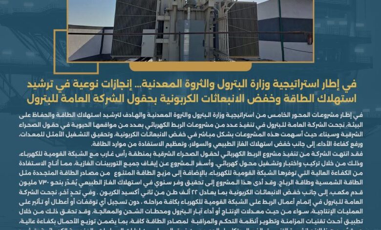 في إطار استراتيجية وزارة البترول والثروة المعدنية… إنجازات نوعية في ترشيد استهلاك الطاقة وخفض الانبعاثات الكربونية بحقول الشركة العامة للبترول