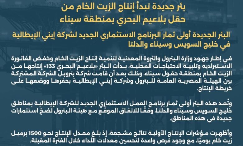 البئر الجديدة أولى ثمار البرنامج الاستثماري الجديد لشركة إيني الإيطالية في خليج السويس وسيناء والدلتا