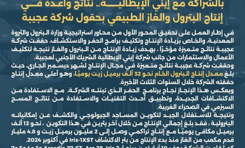 بالشراكة مع إيني الإيطالية.. نتائج واعدة في إنتاج البترول والغاز الطبيعي بحقول شركة عجيبة