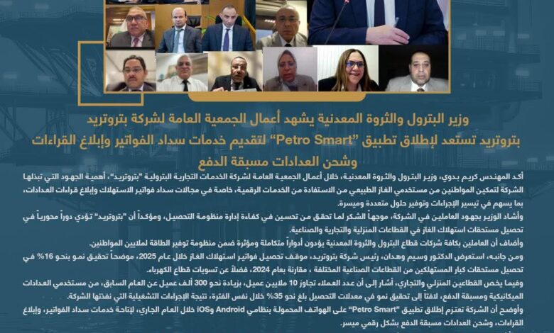 أكد كريم بدوي، وزير البترول والثروة المعدنية، خلال أعمال الجمعية العامة لشركة الخدمات التجارية البترولية “بتروتريد”، أهمية الجهود التي تبذلها الشركة لتمكين المواطنين من مستخدمي الغاز الطبيعي من الاستفادة من الخدمات الرقمية، خاصة في مجالات سداد فواتير الاستهلاك وإبلاغ قراءات العدادات، بما يسهم في تيسير الإجراءات وتوفير حلول متعددة وميسرة.