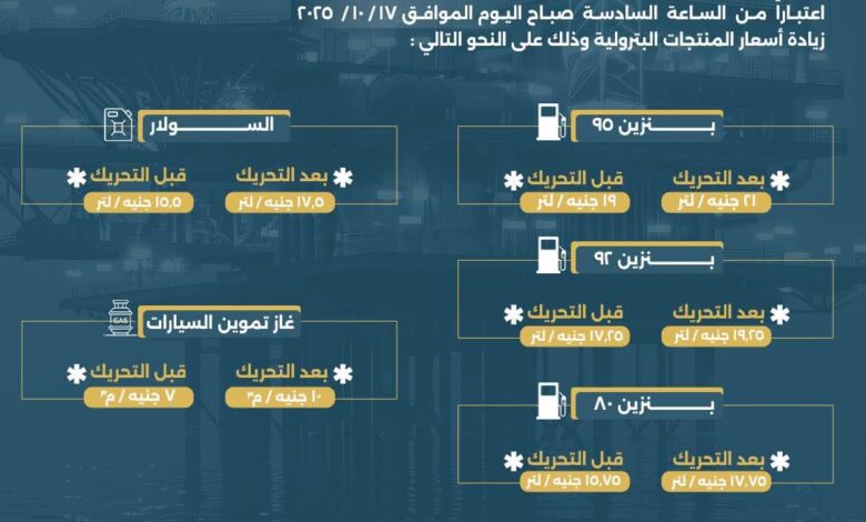 اعتباراً من الساعة السادسة صباح اليوم الموافق 17 / 10/ 2025 زيادة أسعار المنتجات البترولية وذلك على النحو التالي :