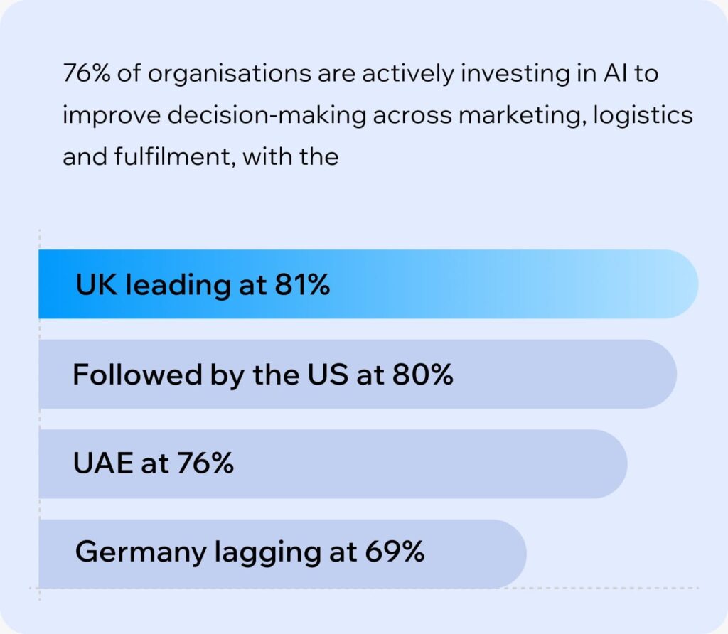 يسلط البحث الضوء أيضًا على الظهور السريع لفكرة “التجارة القائمة على الوكلاء”؛ إذ تدرس أكثر من نصف شركات التجارة الإلكترونية بنسبة 57% حالات استخدام وكلاء الذكاء الاصطناعي، بينما تتطلع 33% منها لنشر هذه التقنية. ويتصدر قطاع الأزياء هذا المشهد، فقد أبدت 46% من العلامات التجارية للأزياء استعدادها لأن يصبح وكلاء الذكاء الاصطناعي قناة أساسية لجذب العملاء وتيسير عملية الشراء. ويستثمر قطاع التجميل أيضًا بكثافة في هذا المجال؛ إذ تبحث 59% من شركاته في مسألة وكلاء الذكاء الاصطناعي، رغم أن 27% منها فقط أفادت بجاهزيتها الكاملة.