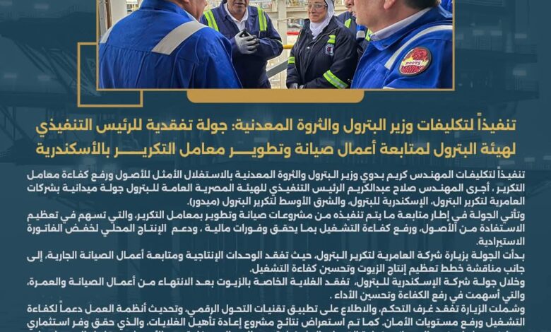 تنفيذاً لتكليفات وزير البترول والثروة المعدنية: جولة تفقدية للرئيس التنفيذي لهيئة البترول لمتابعة أعمال صيانة وتطوير معامل التكرير بالأسكندرية