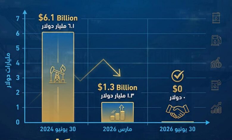 وأشار إلى أن وزارة البترول والثروة المعدنية عملت على الخفض التدريجي لمستحقات شركاء الاستثمار، من نحو 6.1 مليار دولار في 30 يونيو 2024 إلى نحو 1.3 مليار دولار حاليًا، تم التنسيق اللازم تمهيدًا للانتهاء الكامل من تسويتها بحلول 30 يونيو 2026، بالتوازي مع الالتزام بسداد المستحقات الشهرية بانتظام.