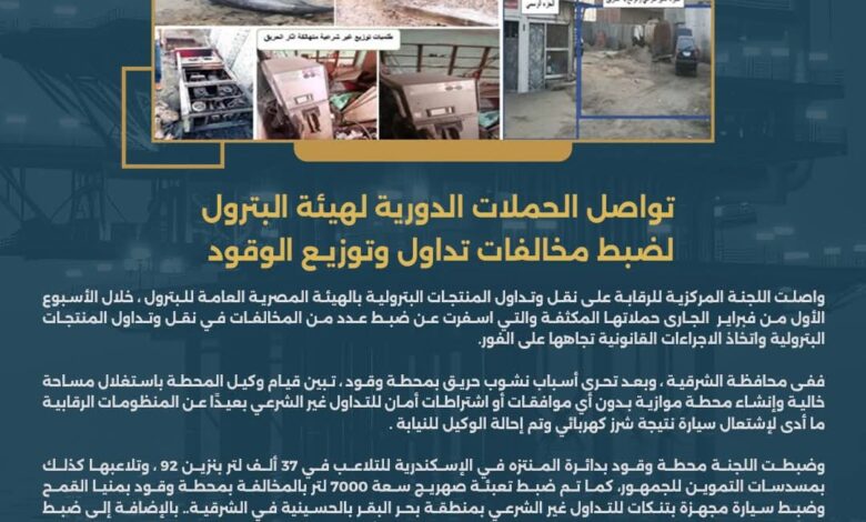 واصلت اللجنة المركزية للرقابة على نقل وتداول المنتجات البترولية بالهيئة المصرية العامة للبترول ، خلال الأسبوع الأول من فبراير الجارى حملاتها المكثفة والتي اسفرت عن ضبط عدد من المخالفات في نقل وتداول المنتجات البترولية واتخاذ الاجراءات القانونية تجاهها على الفور.