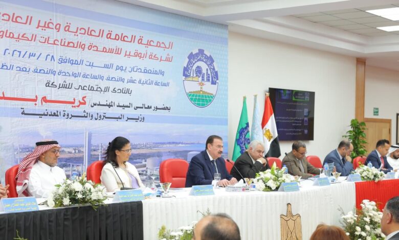 إنعقدت الجمعية العامة العادية وغير العادية لشركة أبوقير للأسمدة والصناعات الكيماوية بمقر الشركة بالأسكندرية، تحت رعاية معالي المهندس كريم بدوي – وزير البترول والثروة المعدنية