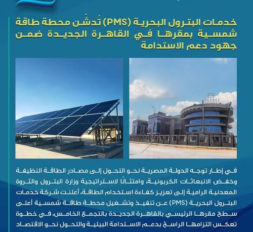 في إطار توجه الدولة المصرية نحو التحول إلى مصادر الطاقة النظيفة وخفض الانبعاثات الكربونية، وامتثالًا لاستراتيجية وزارة البترول والثروة المعدنية الرامية إلى تعزيز كفاءة استخدام الطاقة، أعلنت شركة خدمات البترول البحرية (PMS) عن تنفيذ وتشغيل محطة طاقة شمسية أعلى سطح مقرها الرئيسي بالقاهرة الجديدة بالتجمع الخامس، في خطوة تعكس التزامها الراسخ بدعم الاستدامة البيئية والتحول نحو الاقتصاد منخفض الكربون.