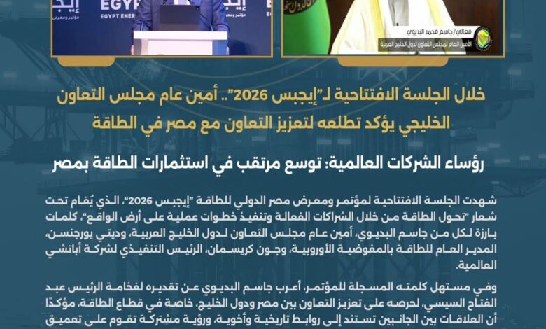 خلال الجلسة الافتتاحية لـ”إيجبس_2026”.. أمين عام مجلس التعاون الخليجي يؤكد تطلعه لتعزيز التعاون مع مصر في الطاقة