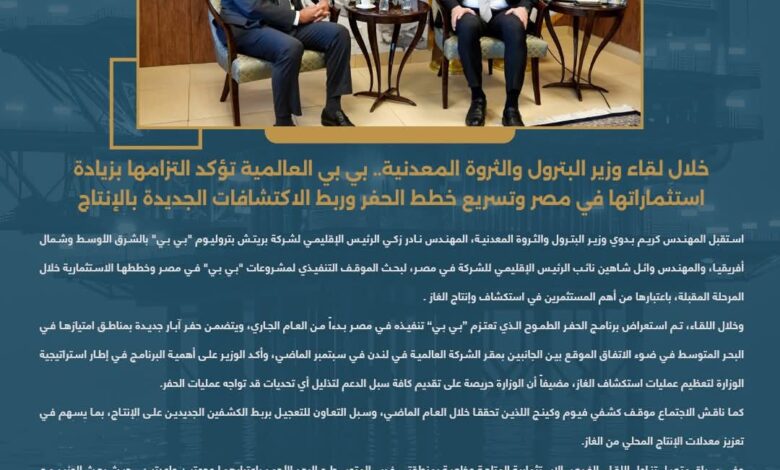 خلال لقاء وزير البترول والثروة المعدنية.. بي بي العالمية تؤكد التزامها بزيادة استثماراتها في مصر وتسريع خطط الحفر وربط الاكتشافات الجديدة بالإنتاج