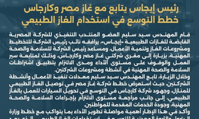 وخلال الزيارة، تابع سيد سليم معدلات تنفيذ الأعمال وأنشطة الشركتين، حيث استعرض خطط شركة غاز مصر في توصيل الغاز الطبيعي للمنازل، وجهود شركة كارجاس في التوسع في تحويل السيارات للعمل بالغاز الطبيعي، إلى جانب مراجعة مستوى الالتزام بإجراءات السلامة والصحة المهنية، وجودة الخدمات المقدمة للمواطنين.