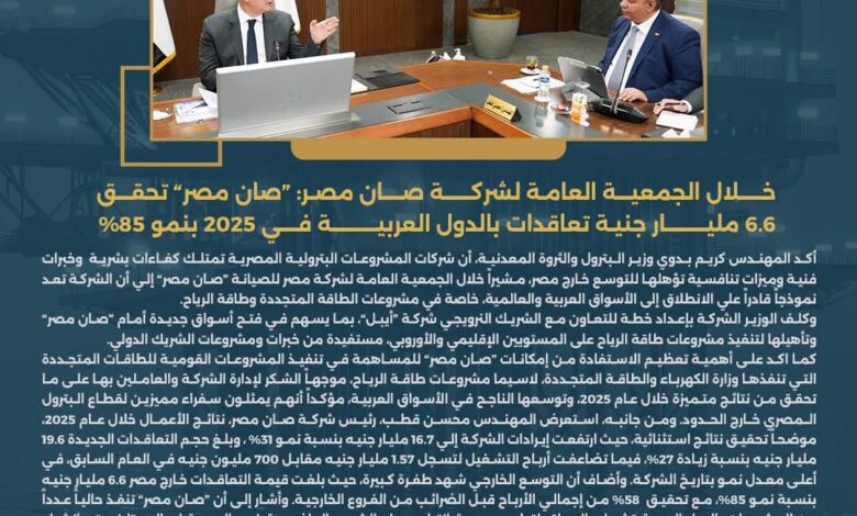 كما اكد على أهمية تعظيم الاستفادة من إمكانات “صان مصر” للمساهمة في تنفيذ المشروعات القومية للطاقات المتجددة التي تنفذها وزارة الكهرباء والطاقة المتجددة، لاسيما مشروعات طاقة الرياح، موجهاً الشكر لإدارة الشركة والعاملين بها على ما تحقق من نتائج متميزة خلال عام 2025، وتوسعها الناجح في الأسواق العربية، مؤكداً أنهم يمثلون سفراء مميزين لقطاع البترول المصري خارج الحدود.
