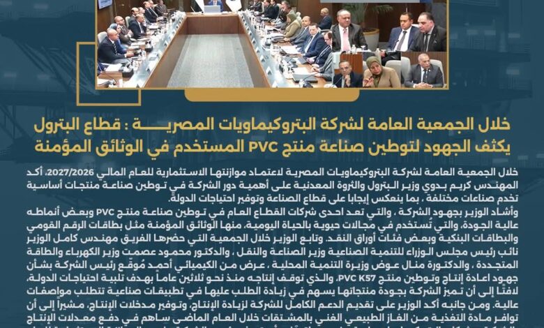 وفى سياق آخر ، أستعرض رئيس الشركة ملامح الموازنة الاستثمارية للعام المالي المقبل ، كما عرض نتائج اعمال النصف الأول من العام المالي الجاري 2025/2026 وتحقيق أعلى خطة إنتاجية من منتج PVC مقارنة بالسنوات الخمس السابقة بإجمالي 41 ألف طن ، والانتهاء من دراسة جدوى لإنشاء خط إنتاج جديد بطاقة 120 ألف طن من المنتج نفسه، مشيراً إلى تزايد الإقبال علي إنتاج الشركة من أحد أنماط منتج PVC المستخدم في صناعة المستلزمات الطبية، والذى لاقى إشادة هيئة الشراء الموحد وكبري الشركات المصنعة للمستلزمات الطبية واعتمادها على منتج الشركة، إضافة لتحقيق الخطة الإنتاجية المعتمدة من الصودا الكاوية خلال النصف الأول من العام بواقع 60 ألف طن.