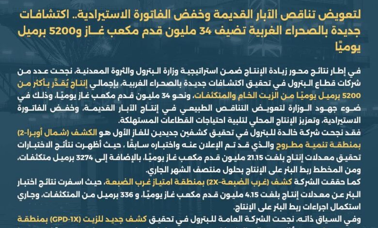 في إطار نتائج محور زيادة الإنتاج ضمن استراتيجية وزارة البترول والثروة المعدنية، نجحت عدد من شركات قطاع البترول في تحقيق اكتشافات جديدة بالصحراء الغربية، بإجمالي إنتاج يُقدَّر بأكثر من 5200 برميل يوميًا من الزيت الخام والمتكثفات، ونحو 34 مليون قدم مكعب غاز يوميًا، وذلك في ضوء جهود الوزارة لتعويض التناقص الطبيعي في إنتاج الآبار القديمة، وخفض الفاتورة الاستيرادية، وتعزيز الإنتاج المحلي لتلبية احتياجات القطاعات المستهلكة.