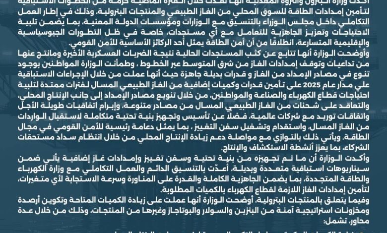 وأكدت الوزارة أن ما تم تجهيزه من بنية تحتية وسفن تغييز وإمدادات غاز إضافية يأتي ضمن سيناريوهات استباقية متعددة وبديلة، أُعدّت بالتنسيق الدائم والعمل التكاملي مع وزارة الكهرباء والطاقة المتجددة، بما يضمن الجاهزية الكاملة والقدرة على المناورة وسرعة الاستجابة لأي متغيرات، لتأمين إمدادات الغاز اللازمة لقطاع الكهرباء بالكميات المطلوبة.