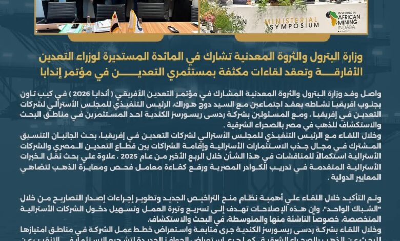 واصل وفد وزارة البترول والثروة المعدنية المشارك في مؤتمر التعدين الأفريقي ( أندابا 2026 ) في كيب تاون بجنوب افريقيا نشاطه بعقد اجتماعين مع دوج هوراك، الرئيس التنفيذي للمجلس الأسترالي لشركات التعدين في إفريقيا ، ومع المسئولين بشركة ردسى ريسورسز الكندية احد المستثمرين في مناطق البحث والاستكشاف للذهب في مصر بالصحراء الشرقية .