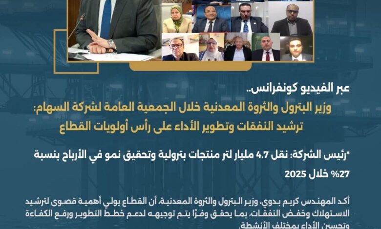جاء ذلك خلال الجمعية العامة لشركة السهام البترولية، التي عُقدت عبر الفيديو كونفرانس لاعتماد نتائج أعمال عام 2025، بحضور قيادات وزارة البترول، والهيئة المصرية العامة للبترول، وممثلي الجهاز المركزي للمحاسبات.