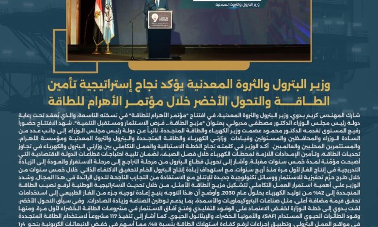 وفي سياق التحول الأخضر، لفت بدوي إلى خطة الوزارة لخفض الاعتماد على الوقود التقليدي وفتح آفاق الاستثمار في مشروعات الطاقة الخضراء لأول مرة، ومنها وقود الطائرات الحيوي المستدام (SAF)، والأمونيا الخضراء، والإيثانول الحيوي. كما أشار إلى تنفيذ 117 مشروعاً لاستخدام الطاقة المتجددة في مواقع العمل البترولي، وتطبيق إجراءات لرفع كفاءة استهلاك الطاقة بنسبة 8%، مما أسهم في خفض الانبعاثات الكربونية بنحو 4ر1 مليون طن.
