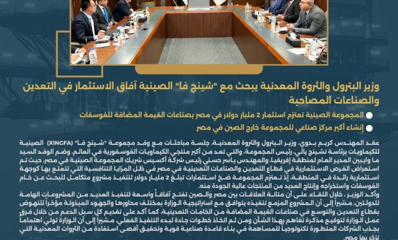 عقد كريم بدوي، وزير البترول والثروة المعدنية، جلسة مباحثات مع وفد مجموعة “شينج فا” (XINGFA) الصينية للكيماويات برئاسة تشينج يالي، رئيس المجموعة، والتي تعد من أكبر منتجي الكيماويات الفوسفورية في العالم، وضم الوفد ما وايبين المدير العام لمنطقة إفريقيا، و ياسر حسني رئيس شركة أكسيس شريك المجموعة الصينية في مصر، حيث تم استعراض الفرص الاستثمارية في قطاع التعدين والصناعات التعدينية في مصر في ظل المزايا التنافسية التي تتمتع بها كوجهة استثمارية رائدة في المنطقة، إذ تعتزم المجموعة ضخ استثمارات تبلغ 2 مليار دولار لتنفيذ مشروع متكامل للبحث عن خام الفوسفات واستخراجه وإنتاج العديد من المنتجات عالية الجودة منه.
