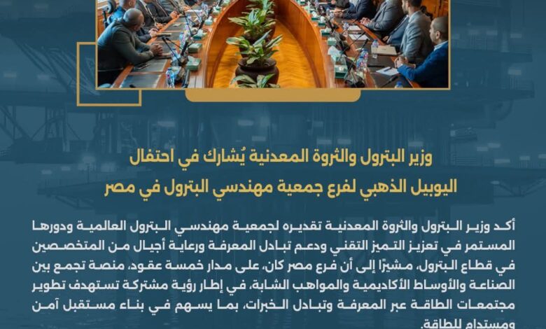 جاء ذلك في كلمة مسجلة أُذيعت خلال الاحتفال بمشاركة الوزير بالاحتفال باليوبيل الذهبي لتأسيس فرع جمعية مهندسي البترول العالمية في مصر، وذلك بحضور جينيفر ميسكيمينز، رئيسة جمعية مهندسي البترول العالمية، و سعيد عبدالمنعم، رئيس فرع الجمعية في مصر، إلى جانب عدد من قيادات قطاع البترول وخبراء الصناعة.