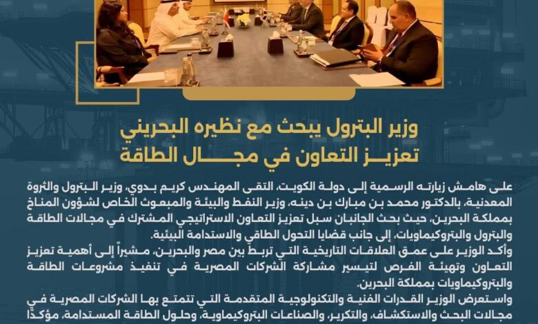 وأكد الوزير على عمق العلاقات التاريخية التي تربط بين مصر والبحرين، مشيراً إلى أهمية تعزيز التعاون وتهيئة الفرص لتيسير مشاركة الشركات المصرية في تنفيذ مشروعات الطاقة والبتروكيماويات بمملكة البحرين.