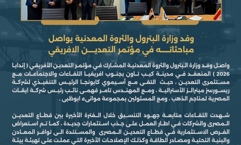 واصل وفد وزارة البترول والثروة المعدنية المشارك في مؤتمر التعدين الأفريقي ( إندابا 2026 ) المنعقد في مدينة كيب تاون بجنوب افريقيا اللقاءات والاجتماعات مع مستثمرى التعدين ، حيث التقى مع أسيموي كابونجا الرئيس التنفيذي لشركة ريسورسز مينرالز الأسترالية ، ومع تامر فهمى نائب رئيس شركة ايقات المصرية لمناجم الذهب ، ومع المسئولين بمجموعة موانىء ابوظبى شهدت اللقاءات متابعة جهود التنسيق خلال الفترة الأخيرة بين قطاع التعدين المصرى والشركات في اطار العمل على جذب استثمارات جديدة ، كما تم استعراض الفرص الاستثمارية في قطاع التعدين المصرى والمستندة الى توافر المعادن والبنية التحتية ومصادر الطاقة وكذلك الإصلاحات الأخيرة التي عملت على تهيئة بيئة استثمارية جديدة واكثر تنافسية في هذا القطاع ، وتشمل الفرص جذب استثمارات جديدة في مجال البحث والتنقيب عن الذهب ، والمعادن الحيوية والاستراتيجية التي تمثل مستقبل الاقتصاد العالمى.