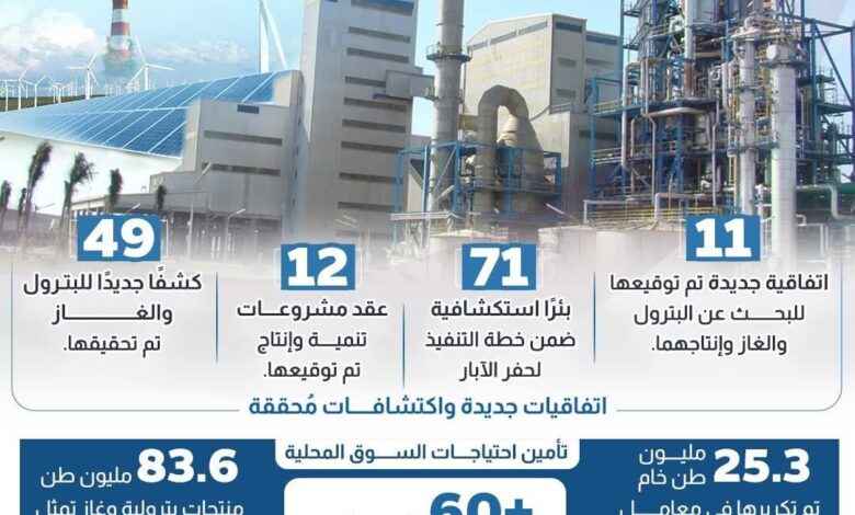 أبرز نتائج الهيئة المصرية العامة للبترول، خلال العام المالى 2024-2025؛ حيث شملت توقيع 11 اتفاقية جديدة للبحث عن البترول والغاز وإنتاجهما، و12 عقدًا لمشروعات تنمية وإنتاج، وتحقيق 49 كشفًا جديدًا للبترول والغاز، وتنفيذ خطة لحفر 71 بئرًا استكشافية.