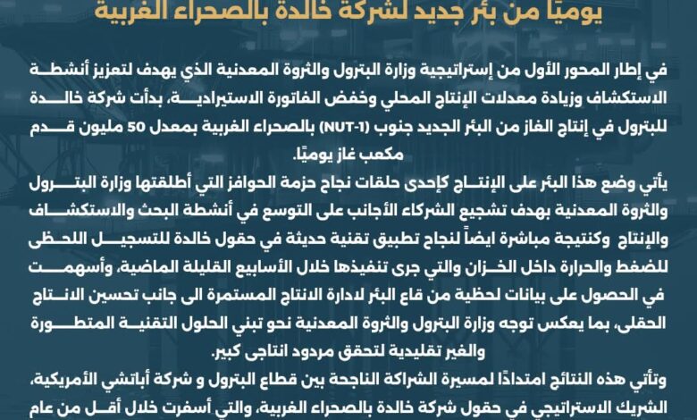 في إطار المحور الأول من إستراتيجية وزارة البترول والثروة المعدنية الذي يهدف لتعزيز أنشطة الاستكشاف وزيادة معدلات الإنتاج المحلي وخفض الفاتورة الاستيرادية، بدأت شركة خالدة للبترول في إنتاج الغاز من البئر الجديد جنوب (NUT-1) بالصحراء الغربية بمعدل 50 مليون قدم مكعب غاز يوميًا.