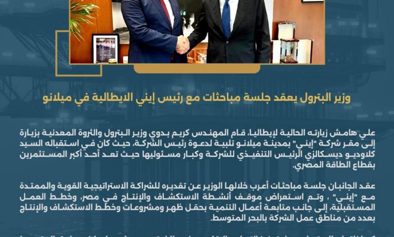 علي هامش زيارته الحالية لإيطاليا، قام كريم بدوي وزير البترول بزيارة إلى مقر شركة “إيني” بمدينة ميلانو تلبية لدعوة رئيس الشركة، حيث كان في استقباله كلاوديو ديسكالزي الرئيس التنفيذي للشركة وكبار مسئوليها حيث تعد أحد أكبر المستثمرين بقطاع الطاقة المصري.