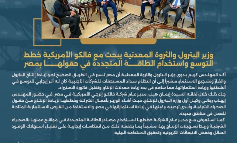 وزير البترول والثروة المعدنية يبحث مع فالكو الأمريكية خطط التوسع واستخدام الطاقة المتجددة في حقولها بمصر