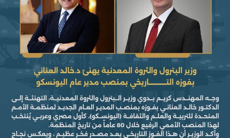 وزير البترول والثروة المعدنية يهنئ خالد العناني بفوزه التاريخي بمنصب مدير عام اليونسكو