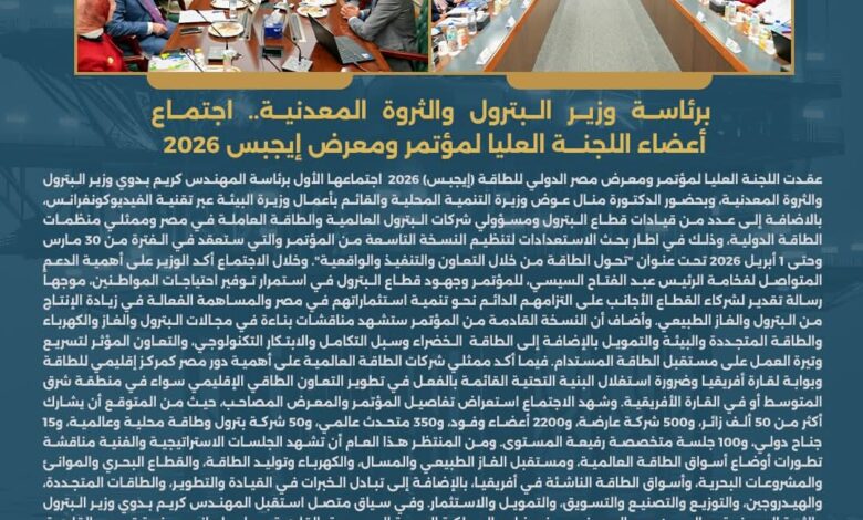 عقدت اللجنة العليا لمؤتمر ومعرض مصر الدولي للطاقة (إيجبس) 2026 اجتماعها الأول برئاسة كريم بدوي وزير البترول والثروة المعدنية، وبحضور منال عوض وزيرة التنمية المحلية والقائم بأعمال وزيرة البيئة عبر تقنية الفيديوكونفرانس، بالاضافة إلى عدد من قيادات قطاع البترول ومسؤولي شركات البترول العالمية والطاقة العاملة في مصر وممثلي منظمات الطاقة الدولية، وذلك في اطار بحث الاستعدادات لتنظيم النسخة التاسعة من المؤتمر والتي ستعقد في الفترة من 30 مارس وحتى 1 أبريل 2026 تحت عنوان “تحول الطاقة من خلال التعاون والتنفيذ والواقعية”.
