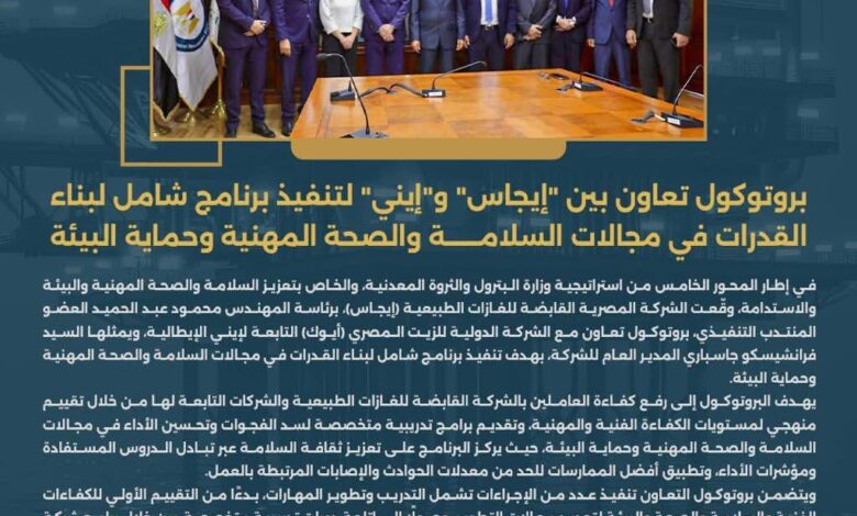 في إطار المحور الخامس من استراتيجية وزارة البترول والثروة المعدنية، والخاص بتعزيز السلامة والصحة المهنية والبيئة والاستدامة، وقّعت الشركة المصرية القابضة للغازات الطبيعية (إيجاس)، برئاسة المهندس محمود عبد الحميد العضو المنتدب التنفيذي، بروتوكول تعاون مع الشركة الدولية للزيت المصري (أيوك) التابعة لإيني الإيطالية، ويمثلها فرانشيسكو جاسباري المدير العام للشركة، بهدف تنفيذ برنامج شامل لبناء القدرات في مجالات السلامة والصحة المهنية وحماية البيئة.