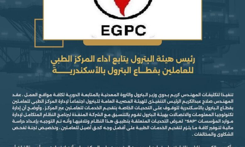 تنفيذا لتكليفات كريم بدوى وزير البترول والثروة المعدنية بالمتابعة الدورية لكافة مواقع العمل ، عقد صلاح عبدالكريم الرئيس التنفيذى للهيئة المصرية العامة للبترول اجتماعاً لإدارة المركز الطبى للعاملين بقطاع البترول بالأسكندرية للوقوف على التحديات الخاصة بتقديم الخدمات للعاملين عبر المركز ، وأوضح أن إدارة تكنولوجيا المعلومات والاتصالات بهيئة البترول تقوم بالتنسيق مع الشركة المنفذة لبرنامج النظام المتكامل لإدارة موارد المؤسسات “SAP” لعرض التحديات المتعلقة بتطبيق هذا النظام وتلافيها وأنه تم التوجيه بإعداد دراسة مالية لتوفير كافة ما يلزم لتقديم الخدمات الطبية على أفضل وجه كحق أصيل للعاملين ، وتخصيص لجنة لفحص الشكاوى والمخالفات .