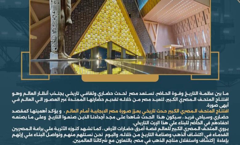 افتتاح المتحف المصري الكبير حدث تاريخي يعزز صورة مصر الايجابية أمام العالم ، و يؤكد أهميتها كمقصد حضاري وسياحي فريد ، سيكون هذا الحدث شاهدا على مجد أجدادنا الذين صنعوا التاريخ وعلى ما يصنعه احفادهم في الحاضر للبناء علي هذا الإرث التاريخي.