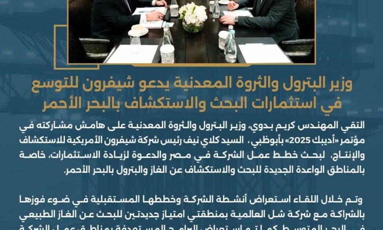 وزير البترول والثروة المعدنية يدعو شيفرون للتوسع في استثمارات البحث والاستكشاف بالبحر الأحمر