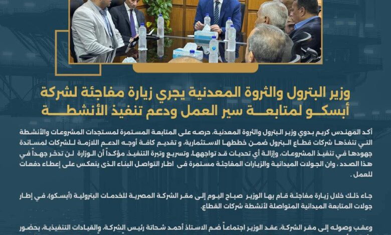 جاء ذلك خلال زيارة مفاجئة قام بها الوزير صباح اليوم إلى مقر الشركة المصرية للخدمات البترولية (أبسكو)، في إطار جولات المتابعة الميدانية المتواصلة لأنشطة شركات القطاع.