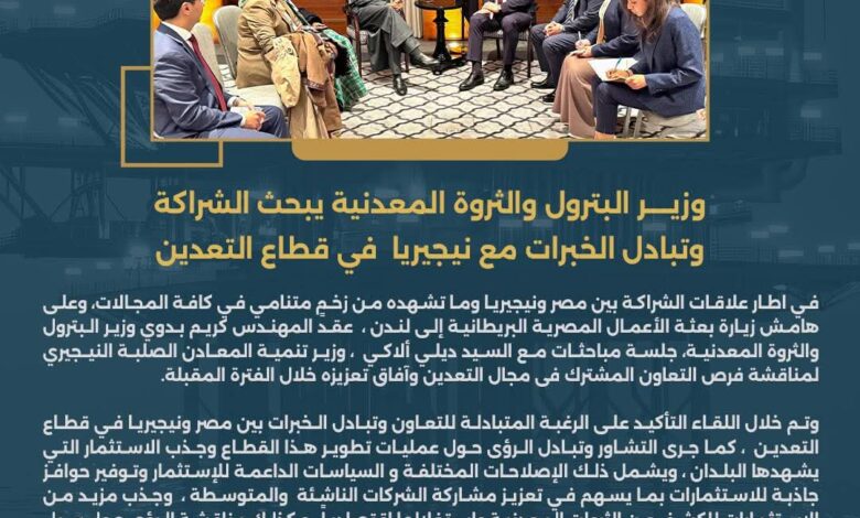 واختتمت المباحثات بالتأكيد على قوة الروابط بين مصر ونيجيريا، والالتزام بتحويل الزخم الإيجابي في العلاقات السياسية والاقتصادية إلى فرص ملموسة في قطاع التعدين تخدم مصالح البلدين.