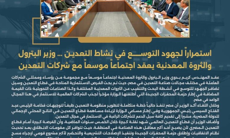 عقد كريم بدوي وزير البترول والثروة المعدنية اجتماعاً موسعاً مع مجموعة من رؤساء وممثلي الشركات العاملة في مختلف مجالات صناعة التعدين في مصر، حيث تم بحث الفرص الاستثمارية المتاحة في قطاع التعدين وسبل تضافر الجهود للتوسع في أنشطة البحث والتنقيب عن الثروات المعدنية المختلفة وكذا الصناعات التحويلية ذات القيمة المضافة في إطار حزمة المحفزات الجديدة التي أطلقتها الوزارة مؤخراً لجذب الشركات العالمية للاستثمار في هذا المجال الواعد في مصر.
