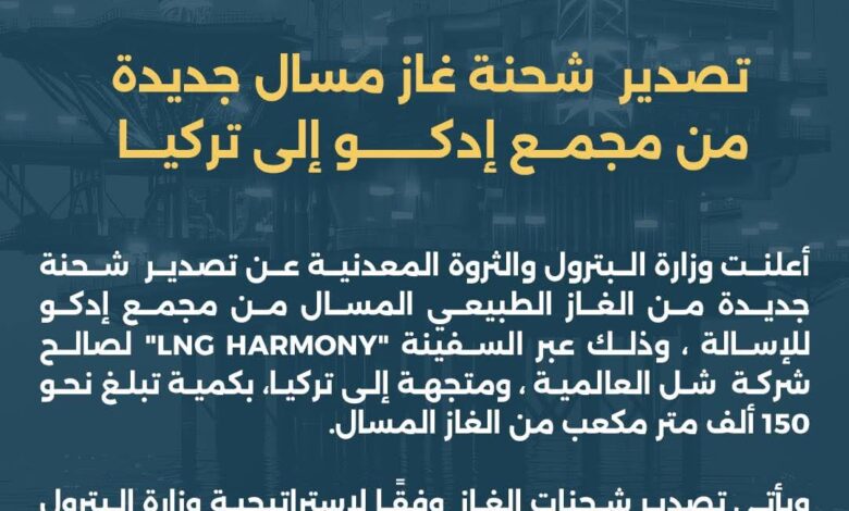 أعلنت وزارة البترول والثروة المعدنية عن تصدير شحنة جديدة من الغاز الطبيعي المسال من مجمع إدكو للإسالة ، وذلك عبر السفينة “LNG HARMONY” لصالح شركة شل العالمية ، ومتجهة إلى تركيا، بكمية تبلغ نحو 150 ألف متر مكعب من الغاز المسال.