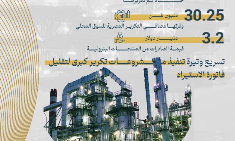 شكلت منظومة مصافي تكرير البترول ، دورًا هاماً في تلبية الاحتياجات المتزايدة للسوق المحلي، حيث تم إنتاج34 مليون طن جرى تكريرها، وتوفير 30.25 مليون طن للسوق المحلي من خلال مصافي التكرير المصرية.