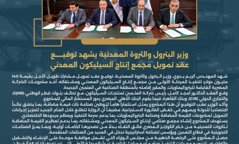 شهد كريم بدوي، وزير البترول والثروة المعدنية، توقيع عقد تمويل مشترك طويل الأجل بقيمة 140 مليون دولار؛ لتنفيذ المرحلة الأولى من مجمع إنتاج السيليكون المعدني ومشتقاته، أحد مشروعات الشركة المصرية القابضة للبتروكيماويات، والمقرر إقامته بالمنطقة الصناعية في العلمين الجديدة.