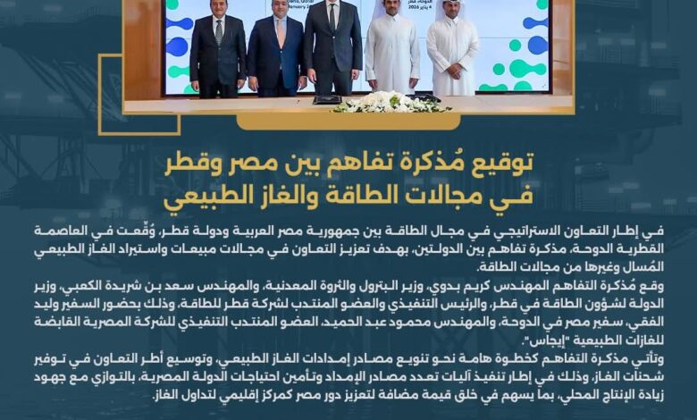 وفي ذات السياق، وقعت كل من الشركة المصرية القابضة للغازات الطبيعية “إيجاس” وشركة قطر للطاقة على بنود الآلية التنفيذية لتوفير عدد من شحنات الغاز الطبيعي المسال القطري، يتم تسليمها في مينائي السخنة ودمياط، وذلك وفقًا للاتفاق المبرم بين الطرفين.