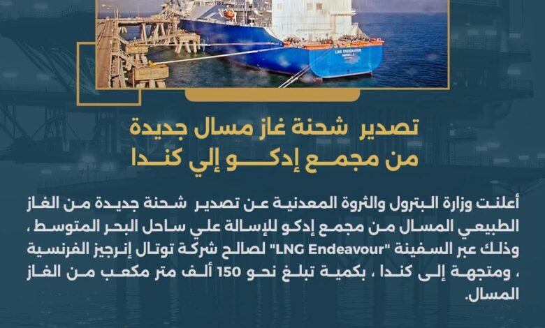 أعلنت وزارة البترول والثروة المعدنية عن تصدير شحنة جديدة من الغاز الطبيعي المسال من مجمع إدكو للإسالة علي ساحل البحر المتوسط ، وذلك عبر السفينة “LNG Endeavour” لصالح شركة توتال إنرجيز الفرنسية ، ومتجهة إلى كندا ، بكمية تبلغ نحو 150 ألف متر مكعب من الغاز المسال.